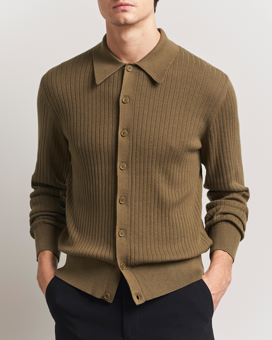 Cotton Merino Ribbed Knitted Cardigan Olive Green